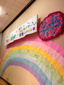 見て下さいこの横断幕。虹色カラーでのお出迎えです。